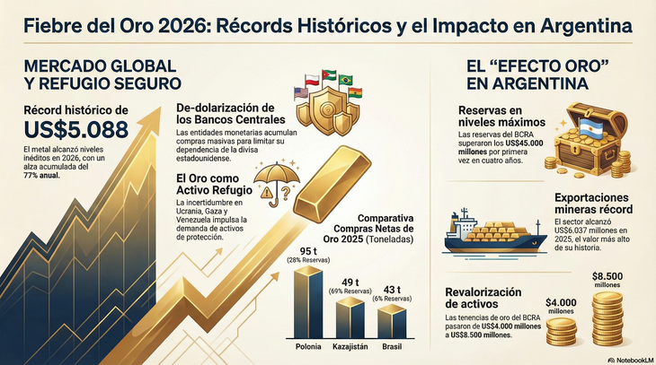 La escalada de precios generó un efecto directo en la solvencia de la autoridad monetaria argentina. Las reservas brutas del BCRA superaron los US$45.000 millones por primera vez en cuatro años. Aunque la Argentina no operó como comprador neto en los informes recientes del Consejo Mundial del Oro, la revalorización de sus activos existentes transformó el balance de la institución. La entidad posee 1,98 millones de onzas troy, equivalentes a unas 61,7 toneladas de metal dorado.