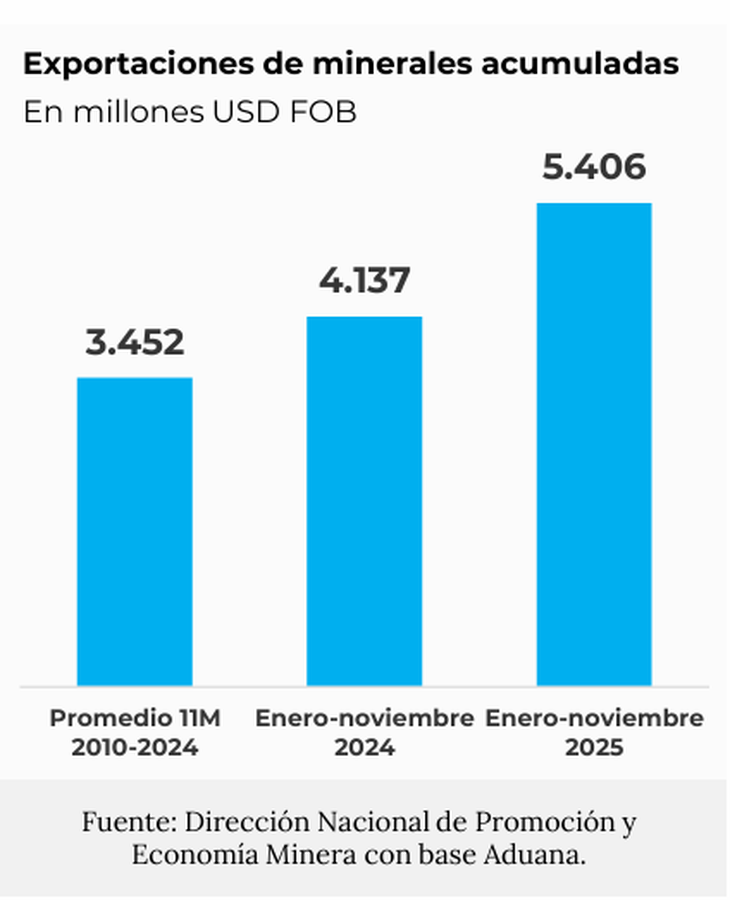 La minería argentina logró récord: exportaciones de USD 5.406 millones hasta noviembre de 2025 superan la media histórica en un 56% impulsadas por el oro y litio.