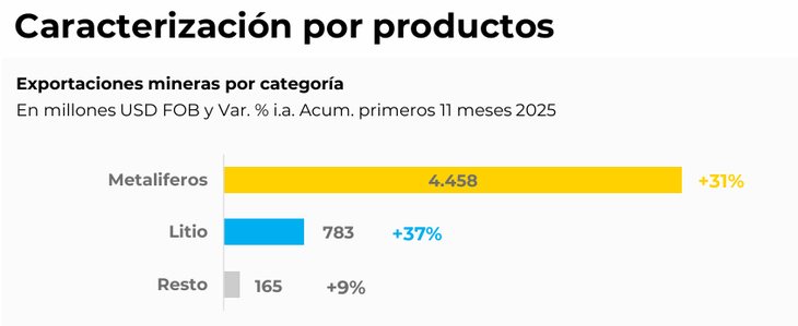 - Plata: Con un aporte de 675 millones de dólares (12% del total), registró un crecimiento acumulado del 13,5%, pese a una desaceleración puntual en el volumen despachado durante noviembre.