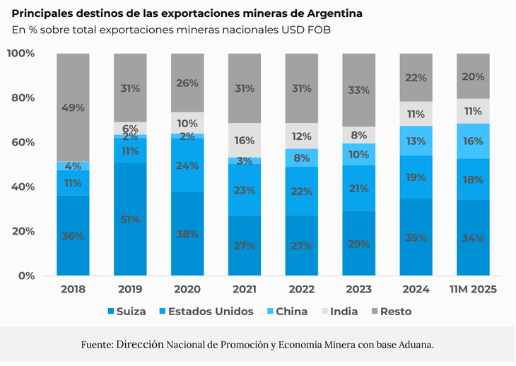 La minería argentina ha logrado capturar mercados de alto valor, concentrando el 76% de sus envíos en cuatro socios principales: