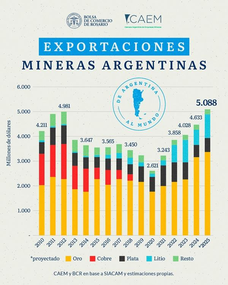 El informe conjunto de la Cámara Argentina de Empresas Mineras (CAEM) y la Bolsa de Comercio de Rosario (BCR) proyecta un crecimiento del 14% en las exportaciones mineras argentinas para 2025, alcanzando un récord histórico en términos nominales. Este hito, que marcaría el quinto año consecutivo de aumento exportador, se sustenta en la creciente demanda global de minerales críticos para la transición energética, a pesar de los desafíos en la producción de oro y plata.