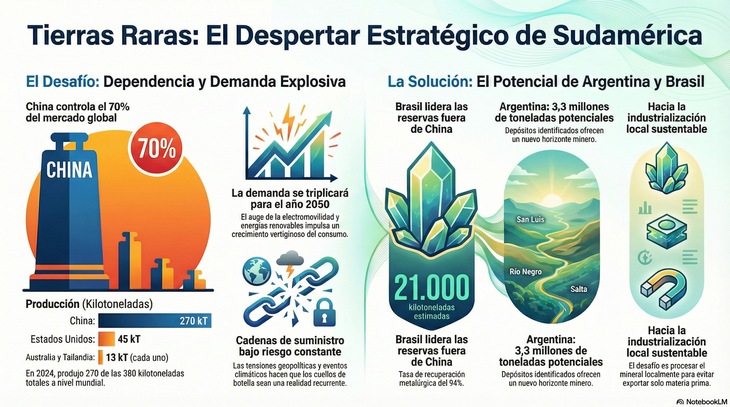 China controla el 70% de las tierras raras. ¿Podrá el potencial de Argentina y Brasil reconfigurar el poder mineral global? Un informe sobre la nueva frontera estratégica.