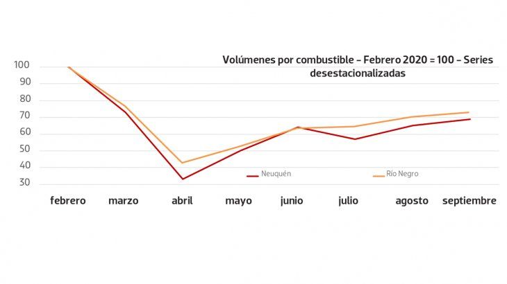 La tendencia de la meseta se puede ver en las provincias de Neuquén y Río Negro, que desde junio observan una remontada de sus ventas muy leve. Las expectativas de la vuelta de equipos de perforación y sets de fractura en Vaca Muerta podrían darle un impulso al gasoil, mientras que la habilitación del turismo ya empieza a convertirse en una chance de recuperar algo de lo perdido para el turismo.