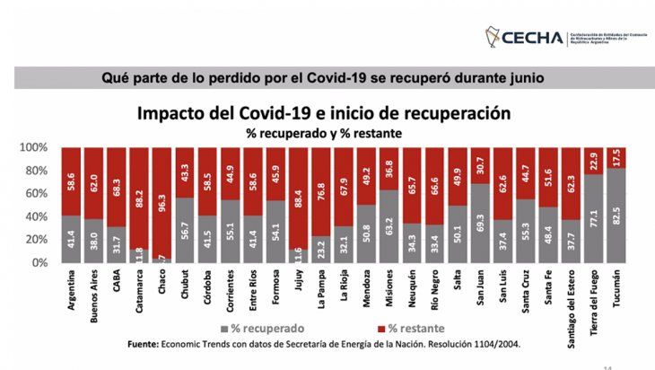 En la provincia de Neuquén hubo caída en los dos indicadores: el gasoil un 9% abajo y las naftas un 11,1% en julio con respecto a junio. El volumen de ventas en junio es el 34,3% de lo que se consumía en febrero. Esto revela el impacto en los surtidores de las medidas de circulación por la transmisión comunitaria del virus y el incremento de casos que obliga a la población a tomar más precauciones. Apenas nueve provincias recuperaron en junio más del 50% de las ventas alcanzadas en febrero.