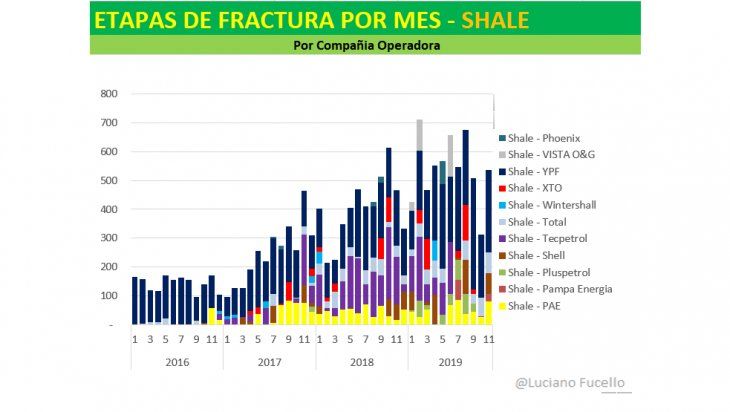 De acuerdo al relevamiento que hace NSC Multistage, en noviembre YPF tuvo rol preponderante al llegar a 286 etapas de fractura en la formación de recursos no convencionales, cuando en octubre había logrado 217, tras alcanzar en septiembre 385 etapas de fractura. A lo largo de noviembre, el resto de las compañías que completaron etapas de fractura shale fueron Pan American Energy con 81, Total con 72, Shell con 71 y Pampa Energía con 27.