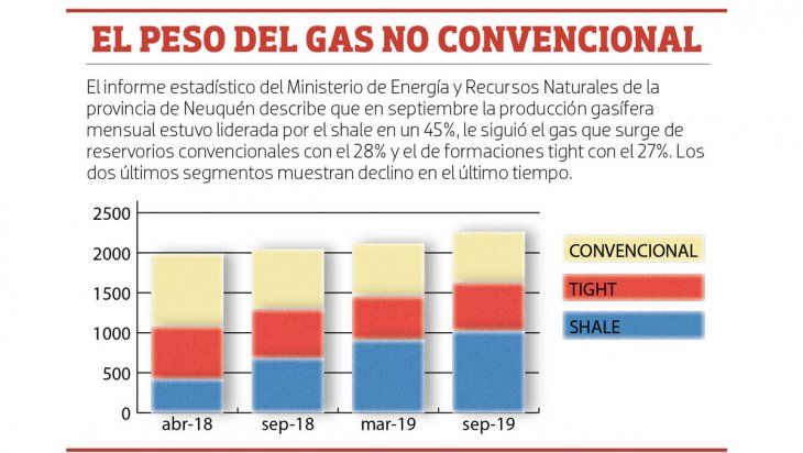 En septiembre, la producción gasífera mensual de Neuquén se componía de la siguiente manera: el 45% venía del shale con 1021 millones de metros cúbicos, el 27% del tight con 603.404 m3 y el 28% de reservorios convencionales con 638.904 m3 -estos dos últimos, en declino-. Así lo describe el informe estadístico del Ministerio de Energía y Recursos Naturales de Neuquén.