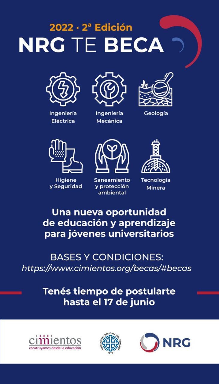 NRG en alianza con Fundación Cimientos y la Universidad Nacional del Comahue convoca, por segundo año consecutivo, a aplicar por una beca económica y acompañamiento personalizado a jóvenes estudiantes universitarios de de Río Negro y Neuquén. Está orientada a quienes quieran o estén estudiando las carreras de Ingeniería Eléctrica, Ingeniería Mecánica, Geología, Higiene y Seguridad, Saneamiento y Protección Ambiental y Tecnología Minera.