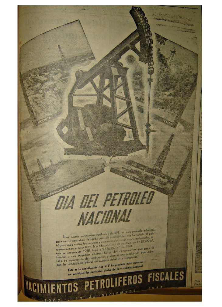 El peronismo profundizó la concepción nacional del petróleo, con el objetivo puesto en el autoabastecimiento de energía y donde la presencia estatal crece para liderar esa industria. “Aquí, además, se comienza a utilizar el quiebre histórico entre el ayer y el hoy, vinculando la fecha del descubrimiento con la del aniversario. Así las propagandas se constituyen como metáfora del desarrollo, pero también de la trayectoria histórica de la actividad petrolera en el país. Esta idea es reafirmada por la abundancia de trazos verticales y oblicuos transmitiendo la fortaleza y expansión de YPF S.E.”, explican más adelante.