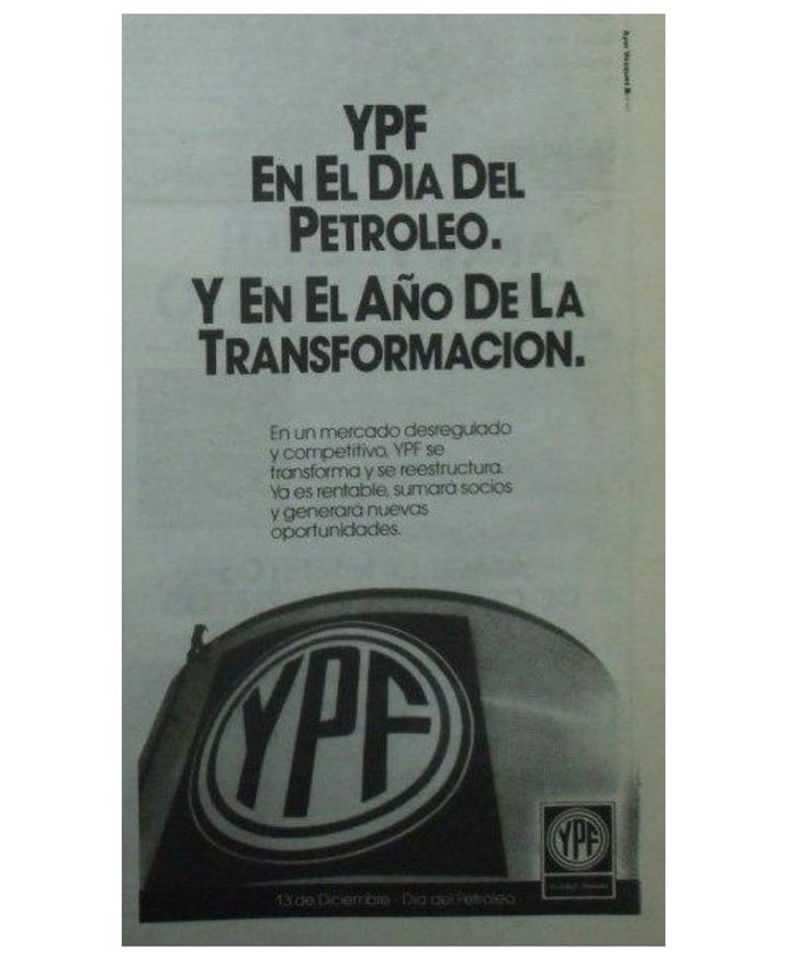 Tras la privatización de YPF, la fecha aniversario pasó a ser una conmemoración y motivo de festejo, dejando de lado cuestiones vinculadas a los orígenes y significaciones nacionales. “El mercado, la comercialización, la industria y las obras de infraestructura se ubican como ejes publicitarios de esta etapa; signada por la ausencia total del hombre en un contexto neoliberal”, observan.
