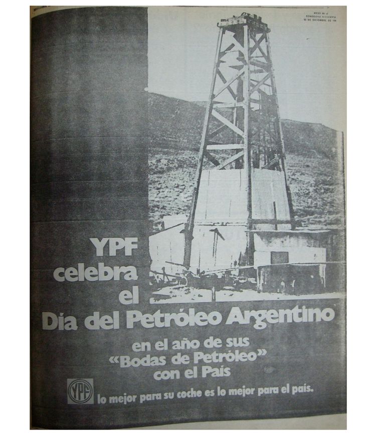 “Entre 1955 y 1973 los avisos revalorizan el descubrimiento con apelaciones contundentes a lo nacional, recuperaciones del pasado y alusiones a un futuro promisorio”, indican Barrionuevo y Contreras en su tesis. Con la la dictadura militar entre 1976 y 1983, “allí hay negaciones del sujeto en pos de la capacidad tecnológica. La idea de futuro (aunque incierto) y las alusiones a la propiedad estatal son una constante, y a comienzos de los 80 se retoma la valorización de los pioneros de 1907 y la tradición histórica”.
