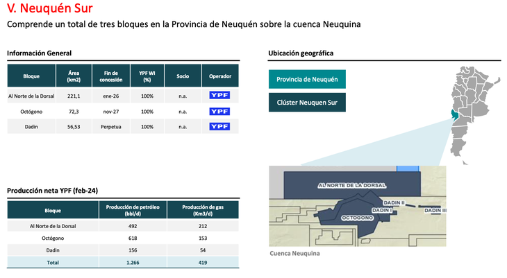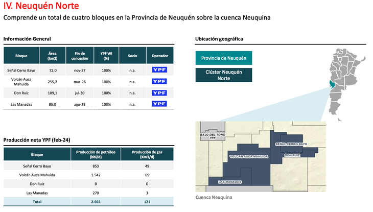 En el caso de Neuquén, YPF definió la oferta en dos clústers de concesiones. Uno es Neuquén Norte, que incluye los campos maduros Señal Cerro Bayo, Volcán Auca Mahuida, Don Ruiz y Las Manadas, en la zona de Rincón de los Sauces, con una producción neta correspondiente a la empresa 2.665 bbl/d de crudo y 121 km3/d de gas, a febrero de 2024.