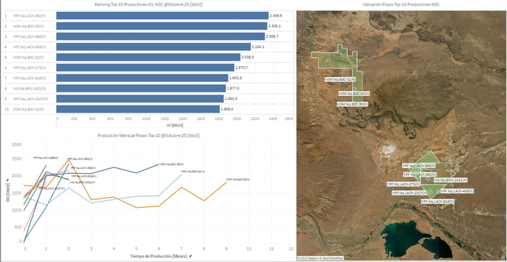 El ranking de octubre muestra una competencia feroz en la cima. El pozo más productivo del mes pertenece a YPF y está ubicado en La Amarga Chica, el área que acaba de destronar a Loma Campana como la mayor productora de petróleo del país.