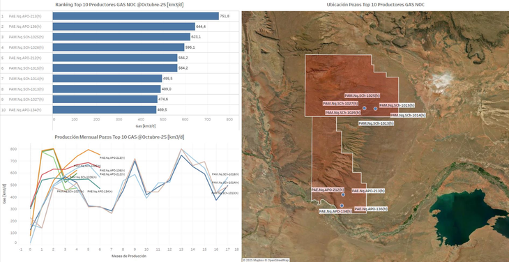 El pozo PAE.Nq.APO-213(h), en Aguada Pichana Oeste, se coronó como el rey del gas en octubre con una producción de 751,8 mil metros cúbicos día (km³/d). Le sigue su "hermano", el APO-136(h), con 644,4 km³/d.