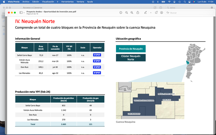 A través del banco Santander, la petrolera envió la información de las concesiones en venta a las posibles compradoras, que en caso de ratificar el interés inicial deberán firmar un acuerdo de confidencialidad para poder acceder al data room con los datos técnicos y económicos de las áreas, así como también a las condiciones. Las compañías interesadas tendrán 30 días para formular ofertas concretas por cada una de las áreas.