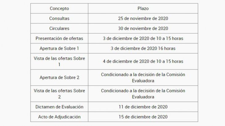 El cronograma se constituye con los días 3 y 4 de diciembre, donde se abren los sobres y se analizan las ofertas. Una Comisión Evaluadora dará su dictamen al respecto que será conocido el 11 de diciembre. En tanto que el acto de adjudicación está programado para el 15 de diciembre próximo.