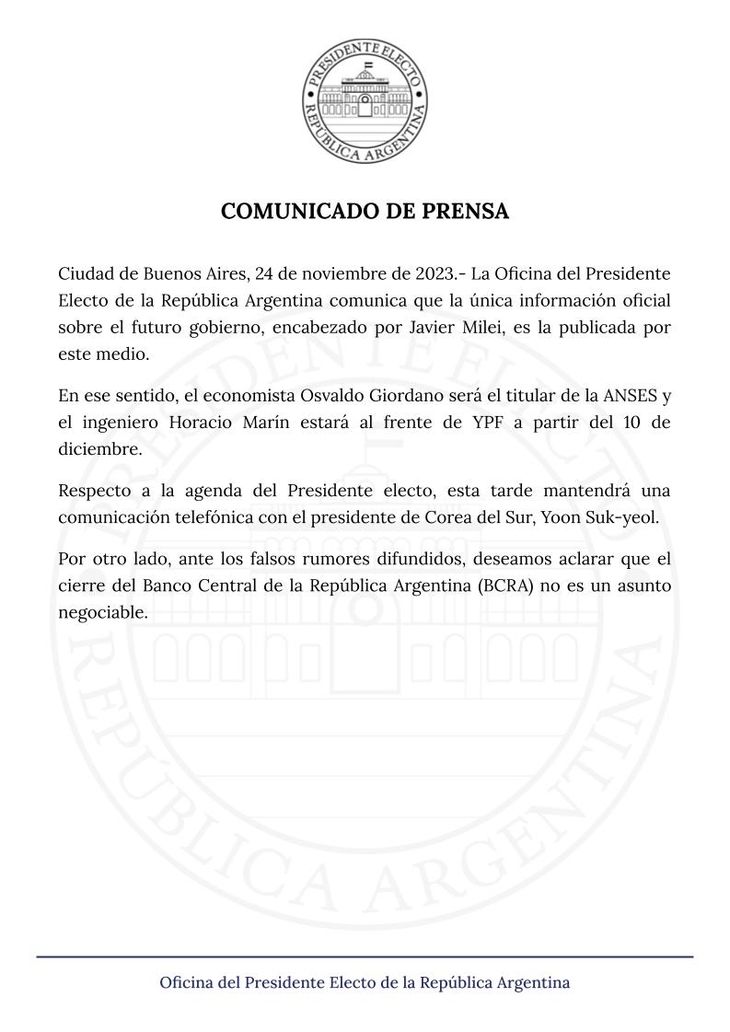 A través de un comunicado publicado en la cuenta "Oficina del Presidente Javier Milei (@OPEArg)" de la red social X (ex Twitter), se confirmó que "el ingeniero Horacio Marín estará al frente de YPF a partir del 10 de diciembre".