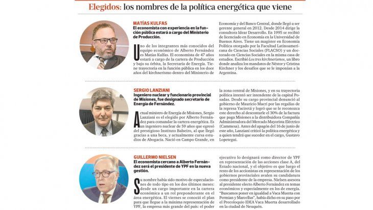 Faltan un par de días para la asunción del nuevo gobierno nacional a cargo de Alberto Fernández. El velo del misterio se comenzó a correr con la designación de los principales referentes del sector energético: Sergio Lanziani quedó al frente de la Secretaría de Energía, en tanto que Guillermo Nielsen fue confirmado ayer para la presidencia de YPF, la mayor productora del país.