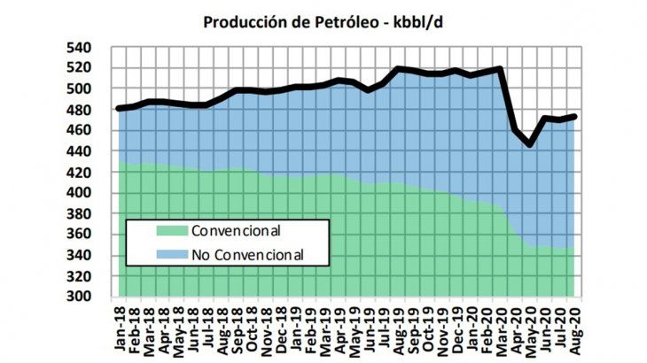 De acuerdo a un informe de Ecolatina, al que accedió +e, la producción de petróleo total en la Argentina fue de 472 mil barriles por día en agosto último. De ese volumen de producción, 348 barriles diarios fueron convencionales en el octavo mes del fatídico año atravesado por el COVID-19 y llegaron a 124 mil los barriles de shale oil de Vaca Muerta en una tendencia creciente que desplaza al convencional(ver gráfico).
