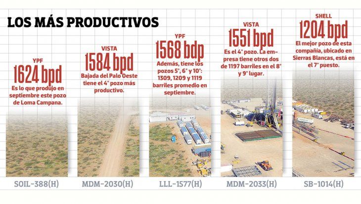Vista tiene dos pozos con un promedio que ronda los 1197 barriles cada día en Bajada del Palo Oeste. Los nombres identificatorios son MdM-2032(h) y MdM-2029(h). En el décimo puesto está el LLL-1576(h) de YPF, con una productividad de 1191 barriles por día en Loma Campana.