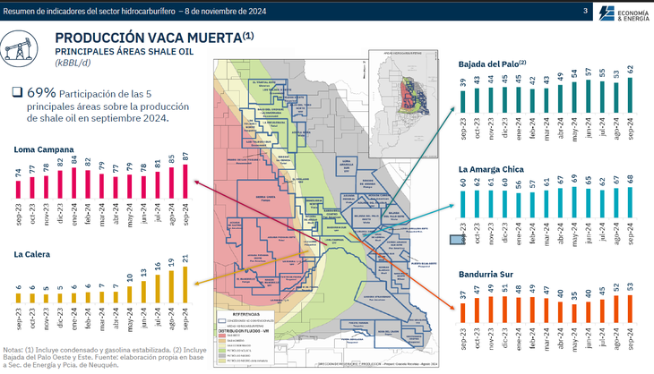La producción de petróleo en Vaca Muerta sigue en ascenso, impulsada por un grupo de áreas y empresas líderes que dominan el sector. En septiembre de 2024, el 69% de la producción total de shale oil provino de las cinco áreas principales: Loma Campana, La Calera, Bajada del Palo, La Amarga Chica y Bandurria Sur.