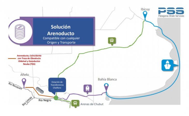 El arenoducto es un sistema que tiene origen en la minería, donde los mineraloductos cuentan con un funcionamiento similar. De acuerdo al proyecto, se generaría un barro con la arena y agua, que podría tomarse del río Negro, y llevarlo a través de un ducto con bombeo realizado con gas. El objetivo es acopiar la arena de Entre Ríos, de Chubut o incluso la importada en un centro que estaría comandado por las empresas interesadas -modelo parecido a Oldelval o a Termap-, y desde este punto enviar la arena a través del arenoducto que llegaría a áreas de Vaca Muerta.