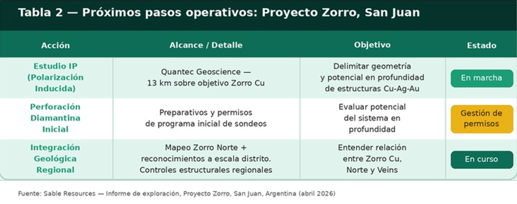 Los resultados respaldan la interpretación de un sistema Cu-Ag-Au aflorante y bien mineralizado, con atributos clave de los yacimientos cupríferos a gran escala. La integración del objetivo Zorro Cu con el objetivo magmático-hidrotermal Zorro North —de tamaño similar— y el objetivo epitermal Zorro Veins configura lo que la empresa denomina un "presupuesto generoso de Cu-Ag-Au" que se manifiesta en múltiples estilos de mineralización.