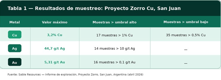 Sable Resources confirma la continuidad de mineralización en Zorro Cu, San Juan, con valores de hasta 3,2% de cobre y avances hacia su primera perforación.