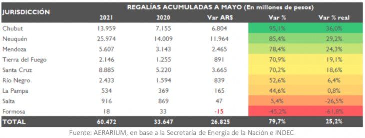 En los primeros cinco meses del año, el total de regalías que cobraron las provincias petroleras acumulan $60.472 millones, un 79.7% por arriba del mismo período de 2020 (+$26.825 millones), con una expansión del 25.2% en moneda constante y del 24.5% en dólares (+u$s 131 millones), de acuerdo a las cifras de un reciente informe de la consultora Aerarium.