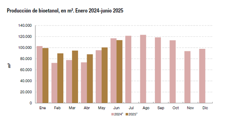 En la vereda opuesta, el bioetanol vive una realidad completamente diferente. La producción total registró un sólido crecimiento del 5,8% interanual. Este avance no depende de un solo insumo, sino que se apoya de manera equilibrada en sus dos fuentes principales: el bioetanol derivado de la caña de azúcar creció un 6,9%, mientras que el elaborado a base de maíz lo hizo en un 5,1%.