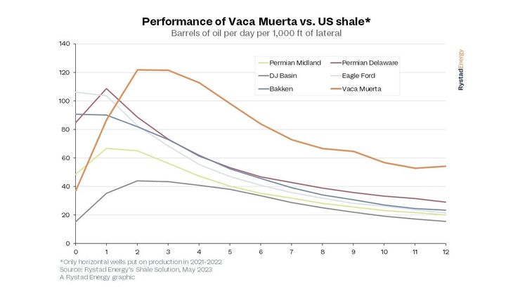 Si bien persisten las preocupaciones sobre el crecimiento, no se prevén problemas con la calidad del petróleo de Vaca Muerta o su capacidad para producir hidrocarburos a escala. La formación -subraya Rystad- se distingue por sus altas presiones y espesor sustancial. Y asegura que la producción de petróleo por metro es demostrablemente superior a la de pozos horizontales similares en los principales yacimientos de esquisto de EE. UU.