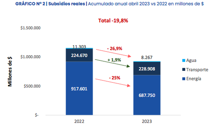 De acuerdo al informe de Tarifas y Subsidios del Observatorio de tarifas y subsidios IIEP (UBA-CONICET), en el primer cuatrimestre de 2023, los subsidios reales cayeron 19,8% a.a. "explicados por una reducción real en energía del 25% a.a. y en agua del 26,9% a.a.", mientras que "el rubro transporte aumentó los subsidios reales en 1,9% a.a.", señalaron.