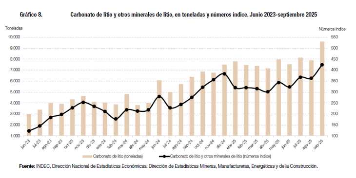 Además, el litio –otro recurso no convencional– beneficia 9.607,2 toneladas en septiembre, con +50,2% interanual y +62,3% acumulado, posicionando a Argentina en la transición verde.