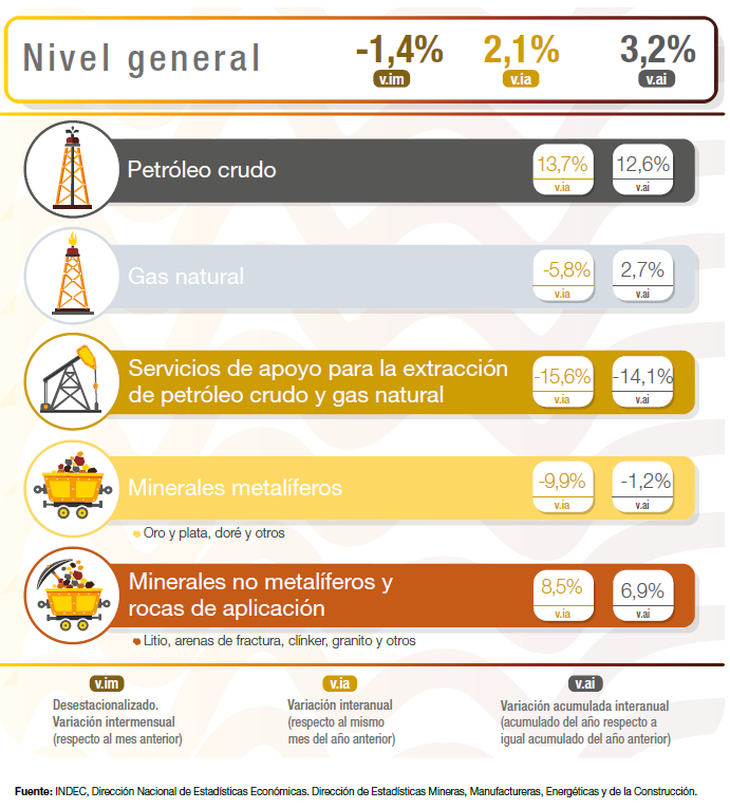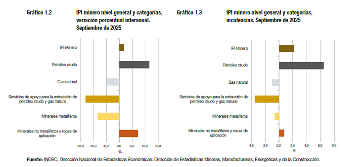 Este desempeño se explica por contrastes sectoriales. La extracción de petróleo crudo y gas natural, junto con servicios de apoyo, contribuye con +2,3% interanual. Los minerales no metalíferos destacan con +8,5%, impulsados por sal y químicos. En cambio, los metalíferos caen 9,9%, afectados por menores volúmenes en oro y plata.