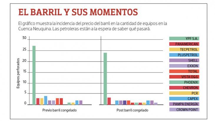 Las fuentes consultadas indican que en el total de áreas en la Cuenca Neuquina hoy son 44 los equipos perforadores en actividad. Tal como lo consigna el gráfico que acompaña esta nota, la principal petrolera del país, YPF, pasó de tener 27 equipos perforando a contar con 24. Uno de los equipos desafectados estaba en el área Rincón del Mangrullo, otro en Estación Fernández Oro y un tercero en Loma La Lata.