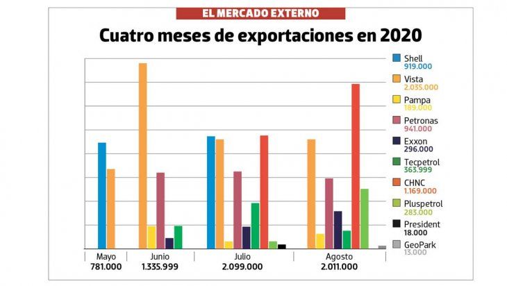 En quinto lugar se ubica ExxonMobil, que exportó 158.000 barriles durante agosto y viene de meterse en un plan de tres meses de envíos desde junio. En total, desde la Cuenca Neuquina sacó 296.000 barriles.