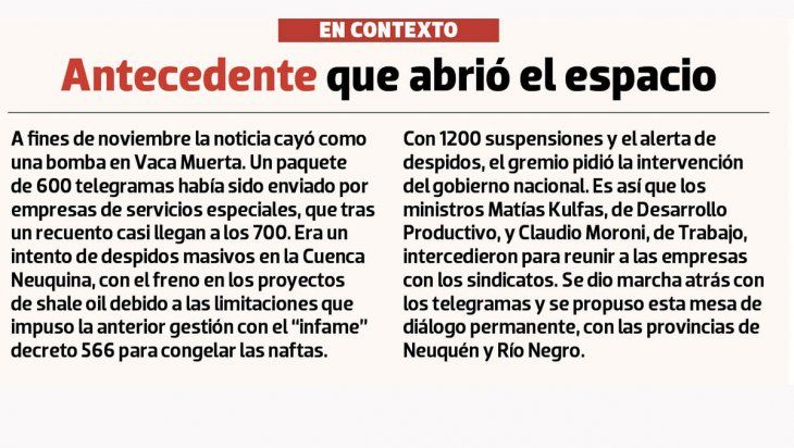 Además de gremios y empresas, estaban invitados a participar los gobiernos de Neuquén y Río Negro. Quien apuntó que esta mesa no tuvo avances fue Guillermo Pereyra, el secretario general del Sindicato del Petróleo y Gas Privado de Río Negro, Neuquén y La Pampa.
