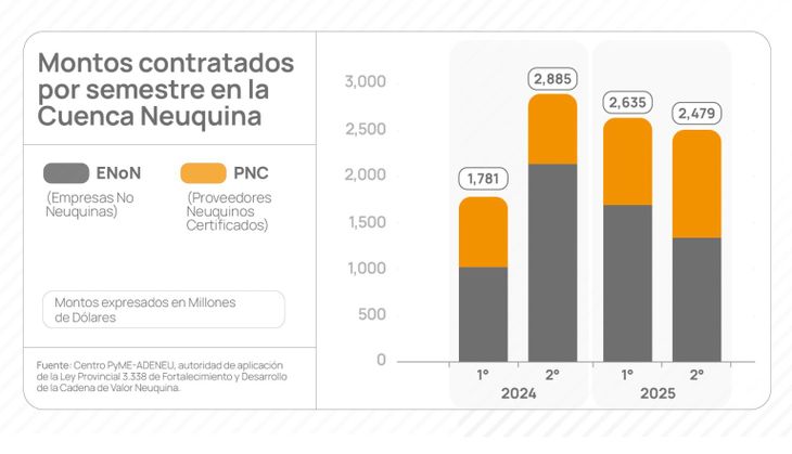 El segundo semestre de 2025 el nivel de contrataciones de pymes certificadas neuquinas que brindan servicios y bienes para la industria del Oil and Gas en Vaca Muerta registró un aumento de 20 puntos porcentuales con respecto al mismo período del año anterior, al alcanzar un 46%.