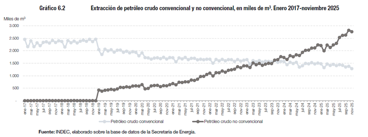En petróleo crudo, el índice llega a 163,2, con un aumento de 12,8% respecto a noviembre de 2024 y 12,9% acumulado. Se extraen 4.041,1 miles de m³ en el mes. El petróleo no convencional brilla con 2.759,0 miles de m³, un salto de 30,7% interanual y 27,3% acumulado. En contraste, el convencional cae a 1.282,0 miles de m³, con bajas de 12,9% y 5,4%. "La extracción de petróleo crudo muestra una suba de 12,8% respecto a igual mes de 2024", indica el informe del INDEC, elaborado con datos de la Secretaría de Energía.