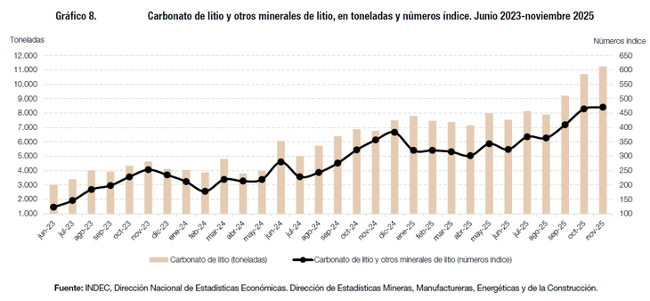 Específicamente, el carbonato de litio y otros minerales de litio alcanzan un índice de 470,2, con avances de 32,0% interanual y 45,6% acumulado. En unidades físicas, se benefician 11.244,3 toneladas en noviembre, un impresionante 66,4% más que en 2024, y un acumulado de 61,4%. "En noviembre de 2025 se beneficiaron 11.244,3 toneladas de 'Carbonato de litio', que registra una suba de 66,4% respecto al mismo mes de 2024", detalla el INDEC.