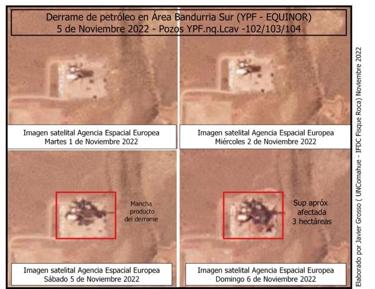 Previo a la circulación de la imagen por drone del pozo, una recopilación de imágenes satelitales del 1 al 6 de noviembre, elaborado por el investigador universitario Javier Grosso, muestra la aparición de la mancha de líquido contaminado y estimó que la superficie afectada sería de aproximadamente tres hectárea. Aunque, como indicó YPF, estaría todo dentro del perímetro de la locación.